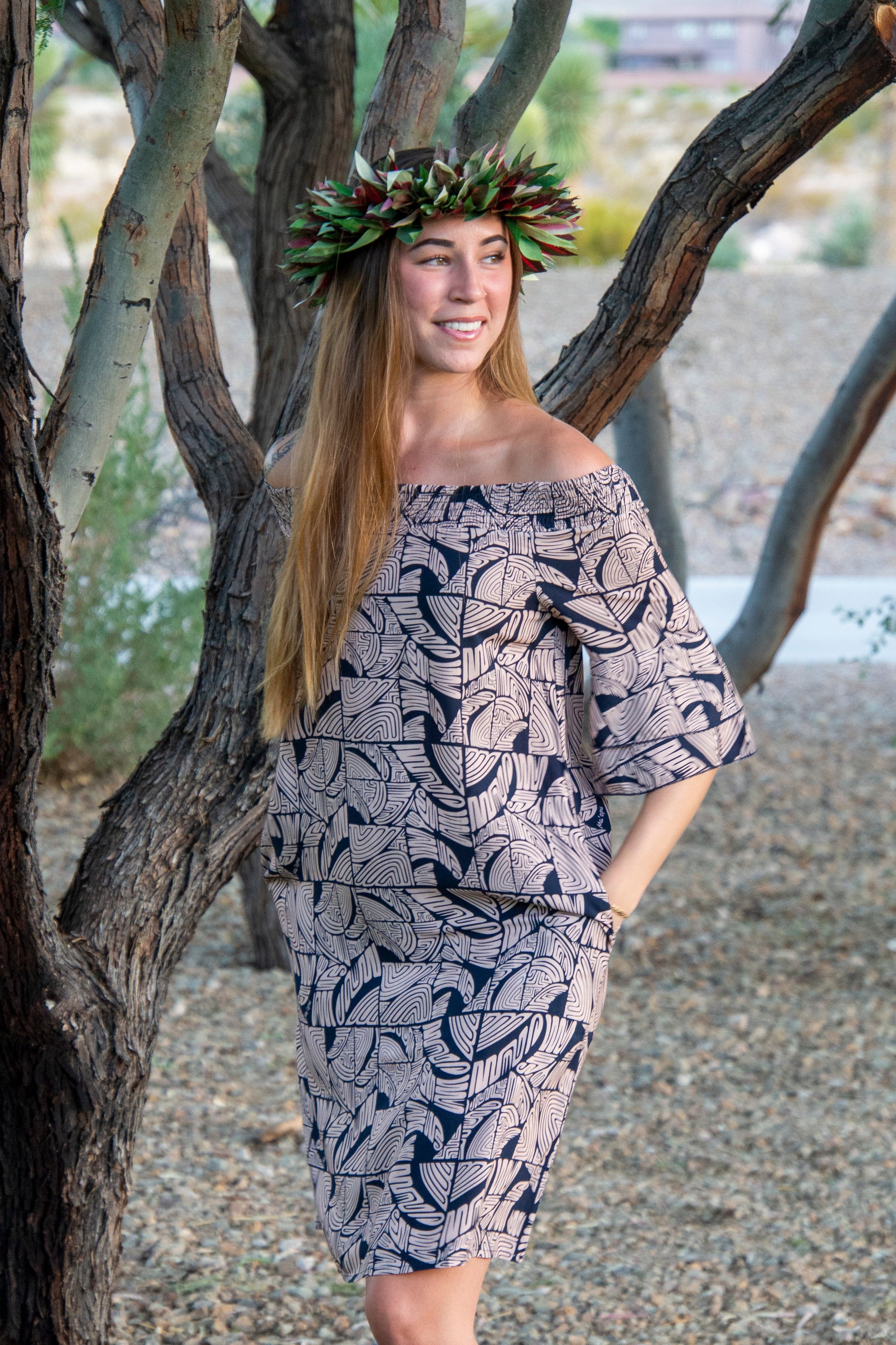 Make a statement with the Gloria Off-Shoulder Dress in our Kona pattern. With its chic off-shoulder style and intricate tribal print, this dress is sure to make heads turn. Perfect for any occasion, from casual to formal. Exude confidence in this must-have piece.
